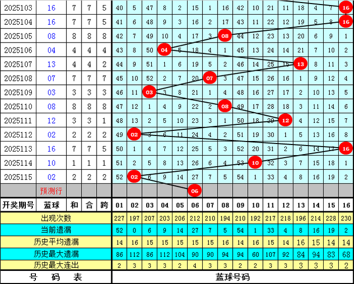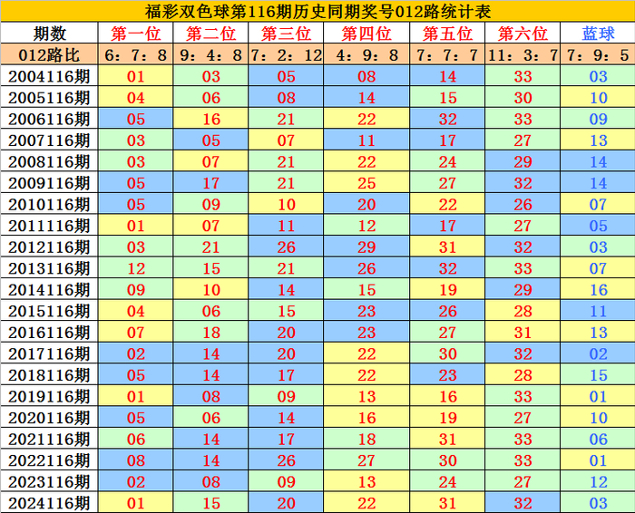蓝球分析:第116期历史同期蓝球号码012路比开出7:9:5,其中2路蓝球明显偏少,本期放弃2路蓝球,关注蓝球06。